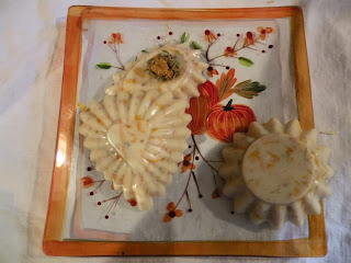 This wonderful glycerin soap has honey as an astringent & moisturizer, oatmeal to relieve itchiness & gently exfoliate, marigold petals (calendula) soothe, and orange oil for a wonderful, clean scent. They are very easy to make and ready in about 4 hours. Package multiple in parchment paper or single in organza bags for gift-giving. Keep a couple for yourself. I know you will really enjoy them. Here's how I made them ...